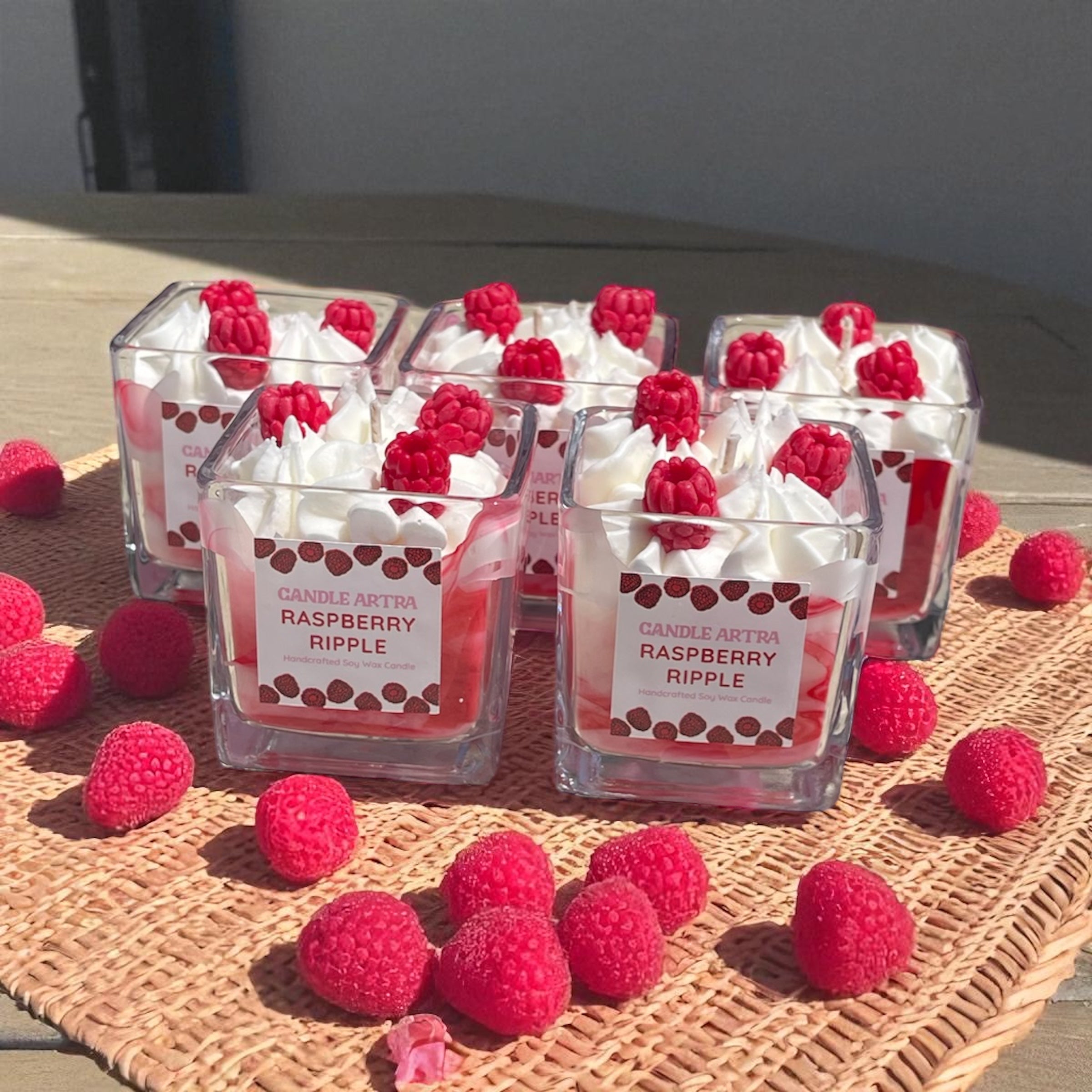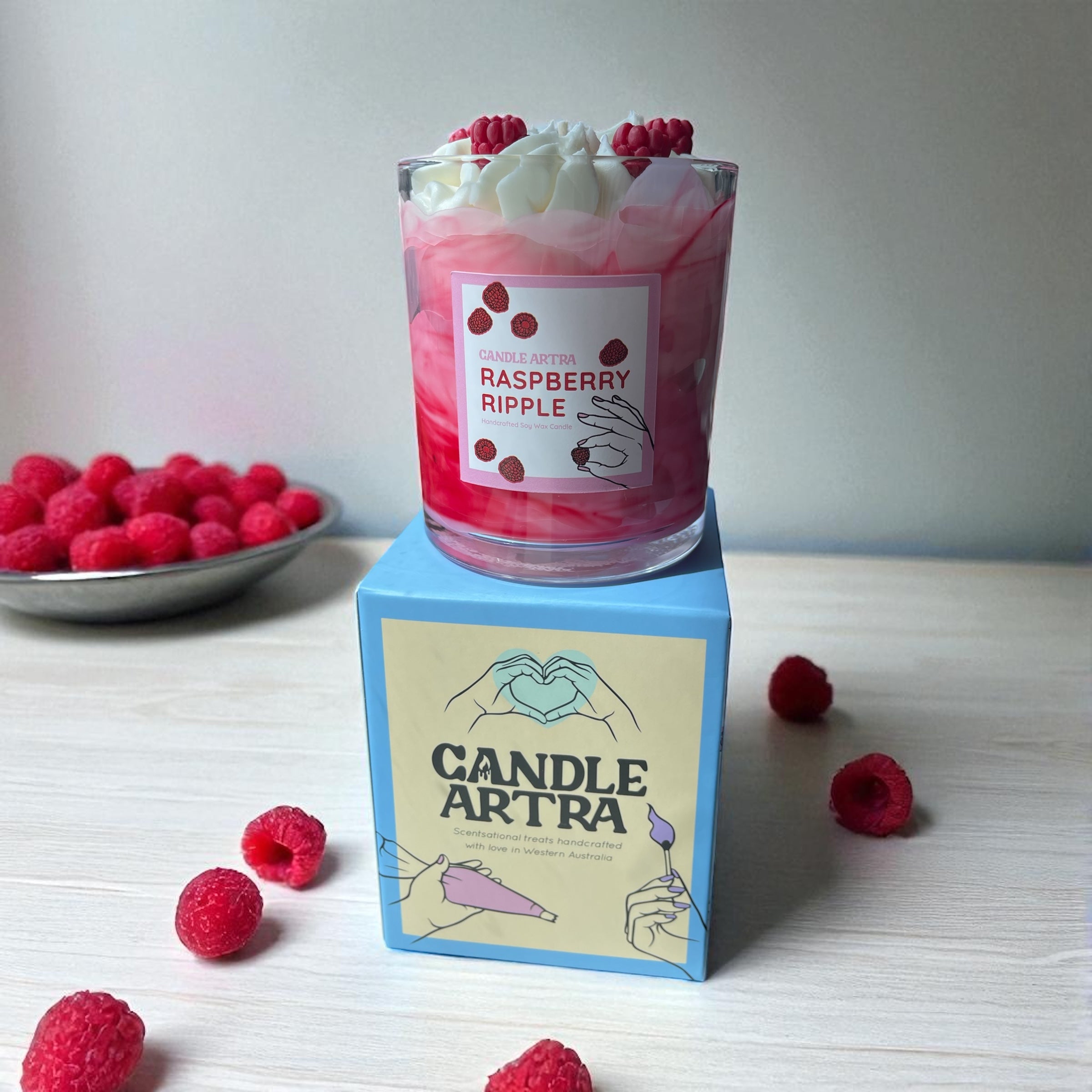 Each candle is lovingly crafted by hand, swirled with a rich red and topped with whipped wax for a true dessert-inspired finish. To top it off, we've added bright red raspberries for a playful charm.