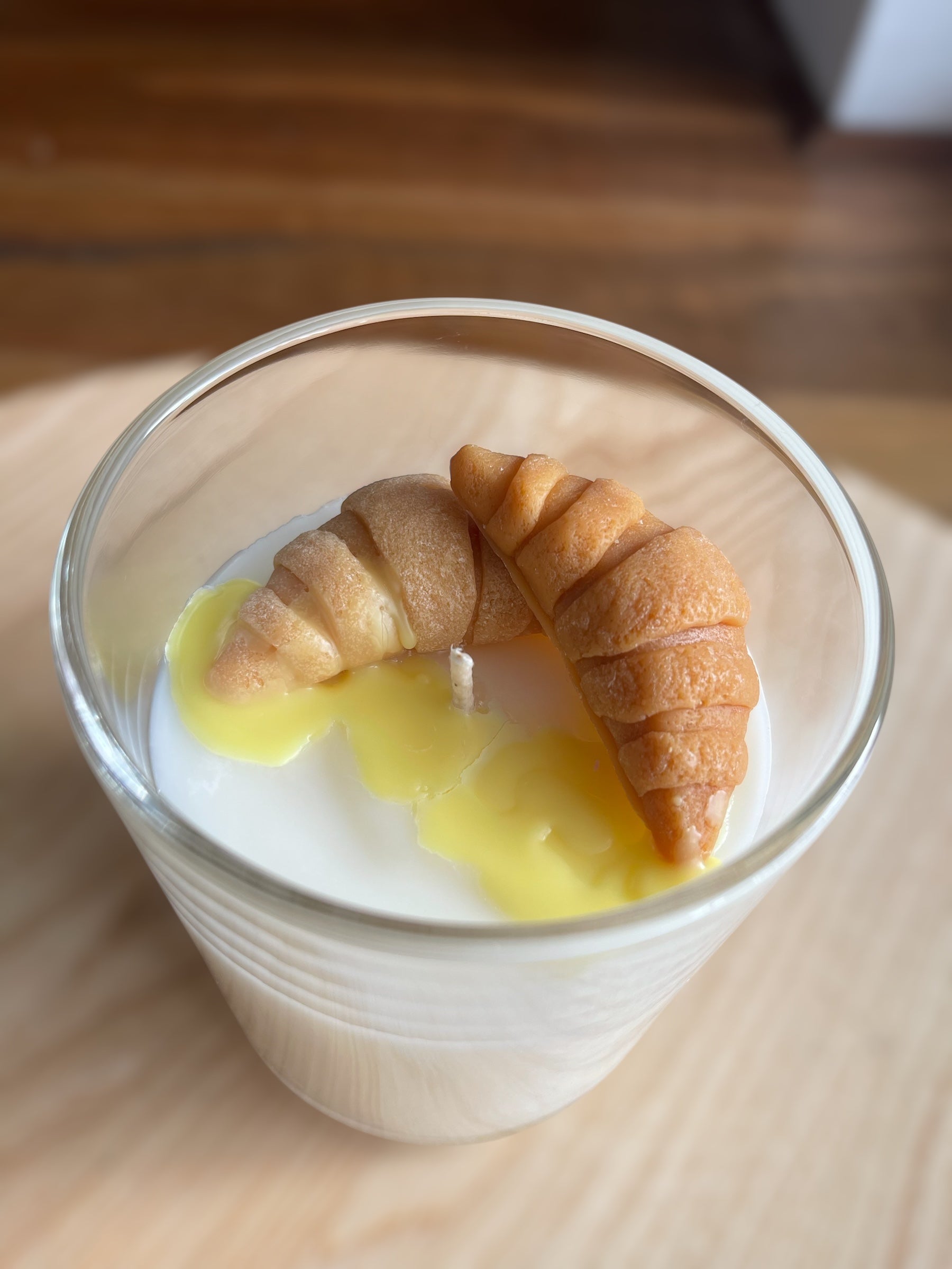 Crafted from soy wax are two croissant replicas, each detailed to look irresistibly real, complete with a drizzle of yellow wax that mimics melted butter. Perfect for cozy mornings, brunch vibes, or whenever you want to escape to a café in the heart of Paris. Bon appétit.