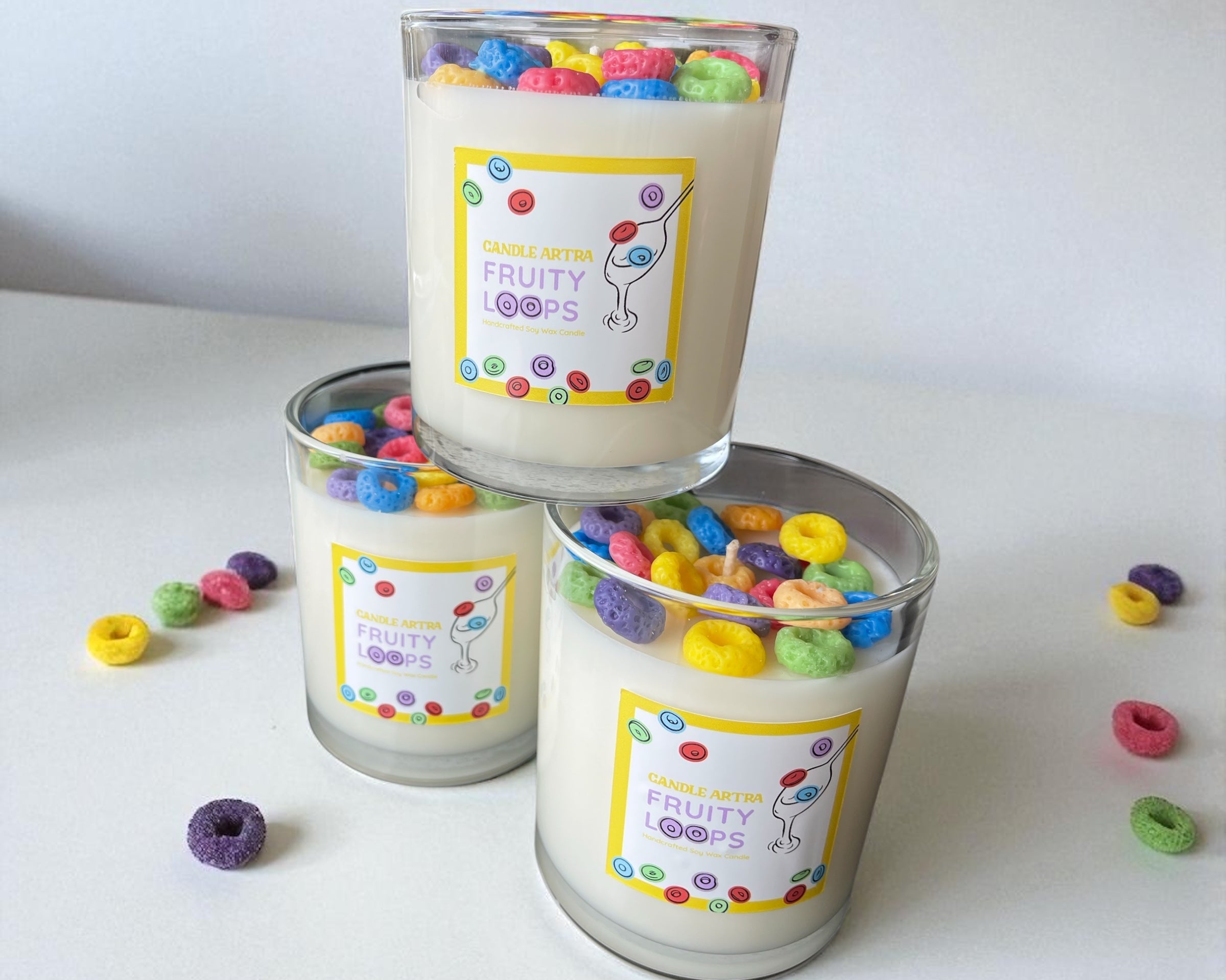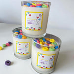 Soy wax hand-poured candle in Fruit Loop fragrance. This candle will provide a wave of nostalgia of your favourite breakfast cereal. The zesty and cereal notes are uplifting and fresh. The candle is topped with realistic and colourful fruit loop details. This is a popular candle not to be missed!